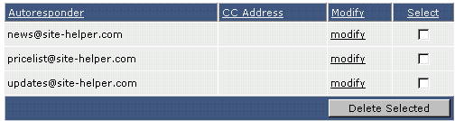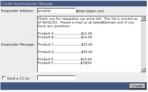 To modify an autoresponder, click the "modify" link next to the autoresponder name. The modify feature allows you to change the autoresponder message and CC: address. When you are finished, click the "Create" button.