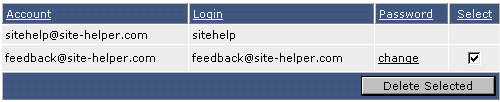 To delete an e-mail account first access the "POP3 E-Mail Accounts" menu. Next, check the box beside the account(s) you wish to delete and press "Delete Selected.