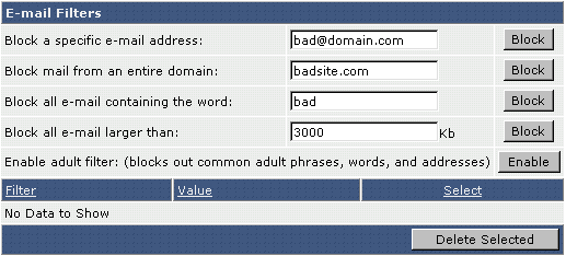 You can block all e-mail containing a specific word by typing in the word and clicking "Block." This feature will look for banned words in both the e-mail subject and body.