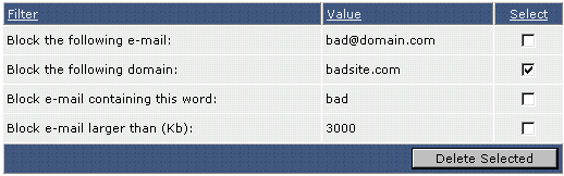 In this example we no longer want to block all e-mail coming from badsite.com. Check the box next to the filter(s) you want to remove and then click the "Delete Selected" button.