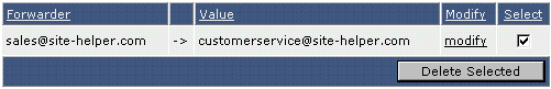 A forwarder can be modified by clicking the "modify" link next to the forwarder address. The modify feature allows you to change the destination e-mail address but not the forwarder name.