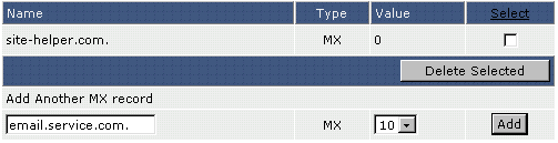 First, delete the old MX record by clicking the checkbox to next to the record name and click "Delete Selected." There should now be no MX records listed.