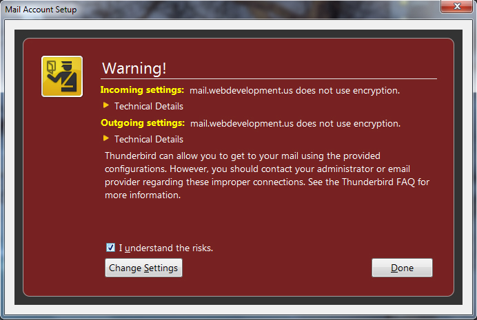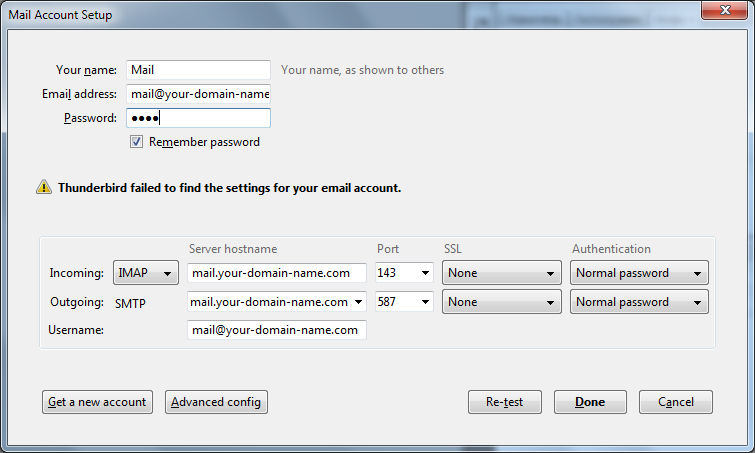 3. Thunderbird will attempt to automatically configure your account settings. Press "Manual Config" to manually set up the the account. Enter the following settings:
