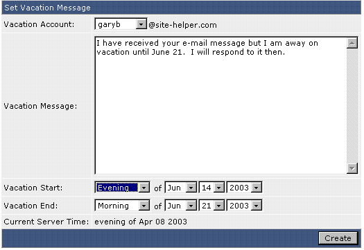 First, select the POP3 account you want to add a vacation message to. Second, enter the vacation message. Third, select when the vacation message will take effect and when it will stop taking effect. Fourth, click the "Create" button.