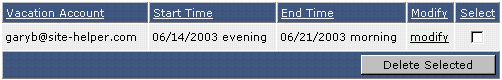 A vacation message may be modified by clicking on the "modify" link next to the vacation account. The modify feature allows you to change the message text, vacation start time, and vacation end time.